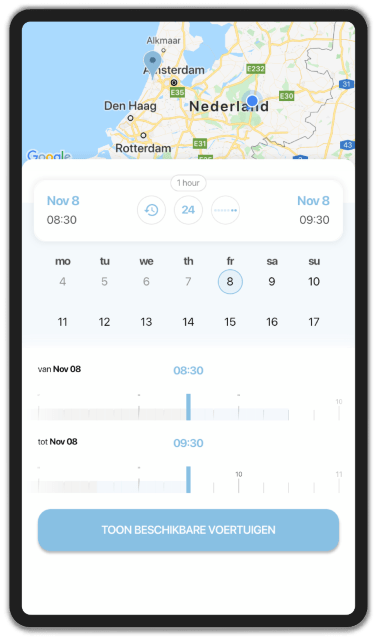 Mobiliteit op maat: altijd eigen duurzame deelauto’s voor zakelijke reizen van al jouw collega’s op jouw locatie. Je eigen mobiliteitshub 24/7 beschikbaar, ook voor privégebruik. Met 100% mobiliteitsgarantie: binnen 30 minuten een vervangende auto als alle deelauto’s in gebruik zijn.